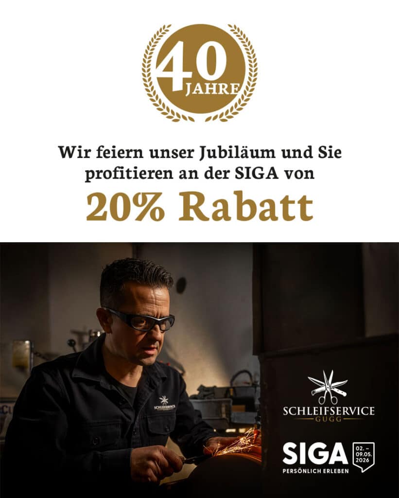Der 20% Jubiläumsrabatt ist gültig auf unser Verkaufssortiment, ausgenommen sind limitierte Produkte. Kommt vorbei und feiert mit uns 40 Jahre Schleifservice Gugg.