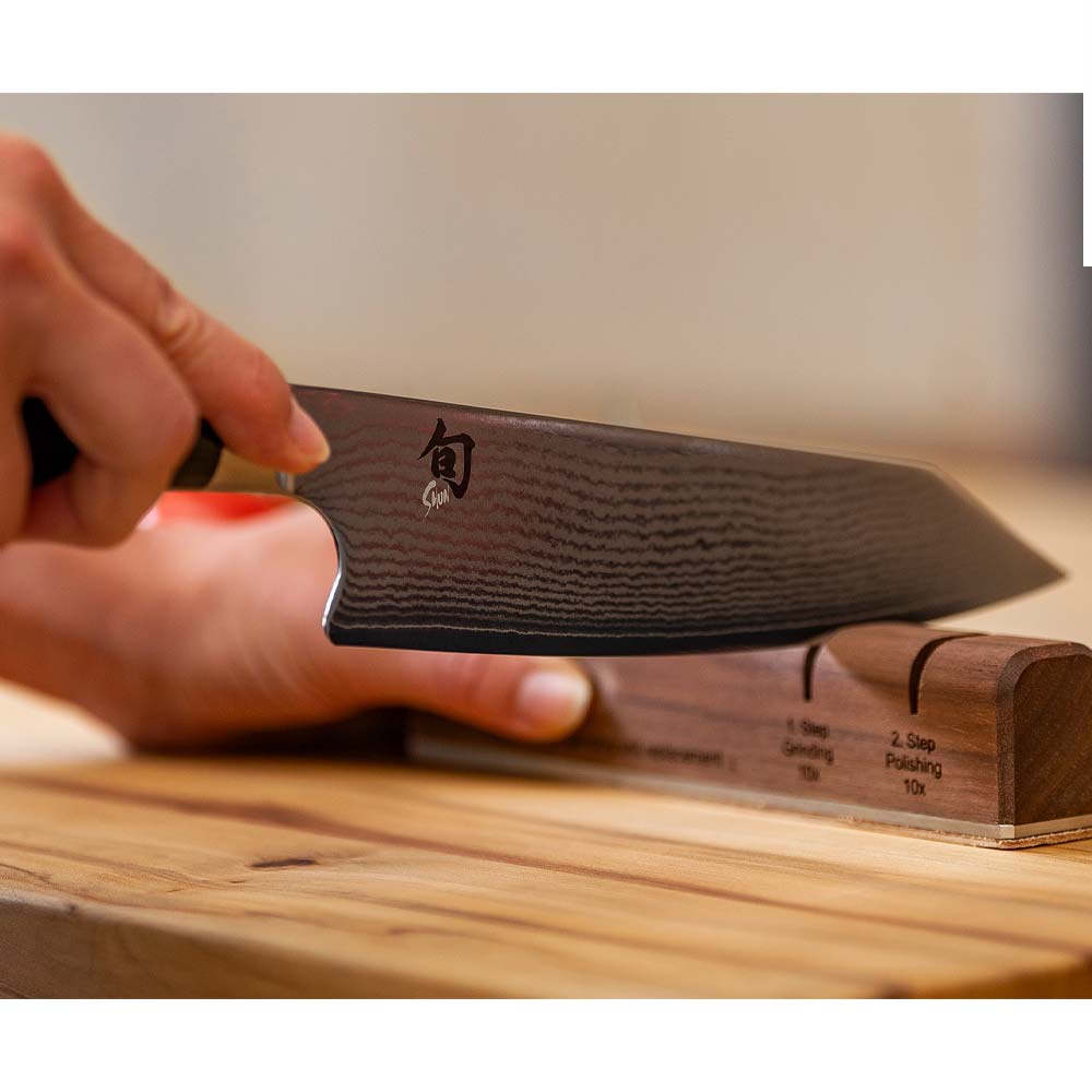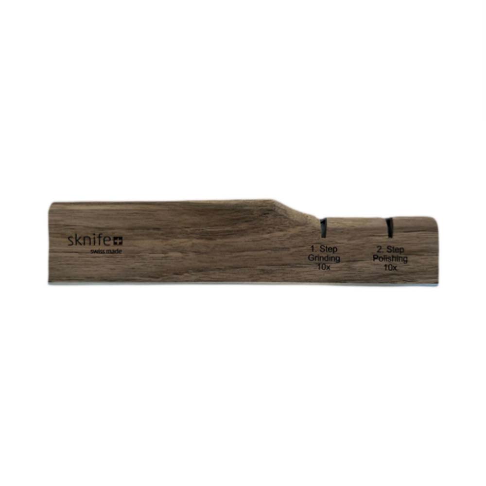Das einfach bedienbare «all in one» Präzisionsschleifgerät ist aus Schweizer Walnussholz hergestellt. Dank dem Diamantleder des Präzisionsschleifgeräts erreichen auch japanische Messer mit wenigen Zügen Rasierklingenschärfe, vergleichbar mit jener neuer Messer.